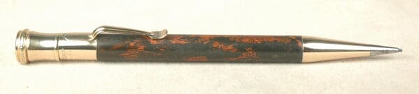 Mottled hard rubber looks fantastic with gold-filled trim on this vintage pencil. This pencil looks fantastic. The steel nose cone has the only wear that is really showing. Twist the top of the pencil to advance the lead. Pull back on the topper to expose a compartment to store spare 1.1mm leads. There is a lead loaded in the pencil but there are no spares. 13.5cm