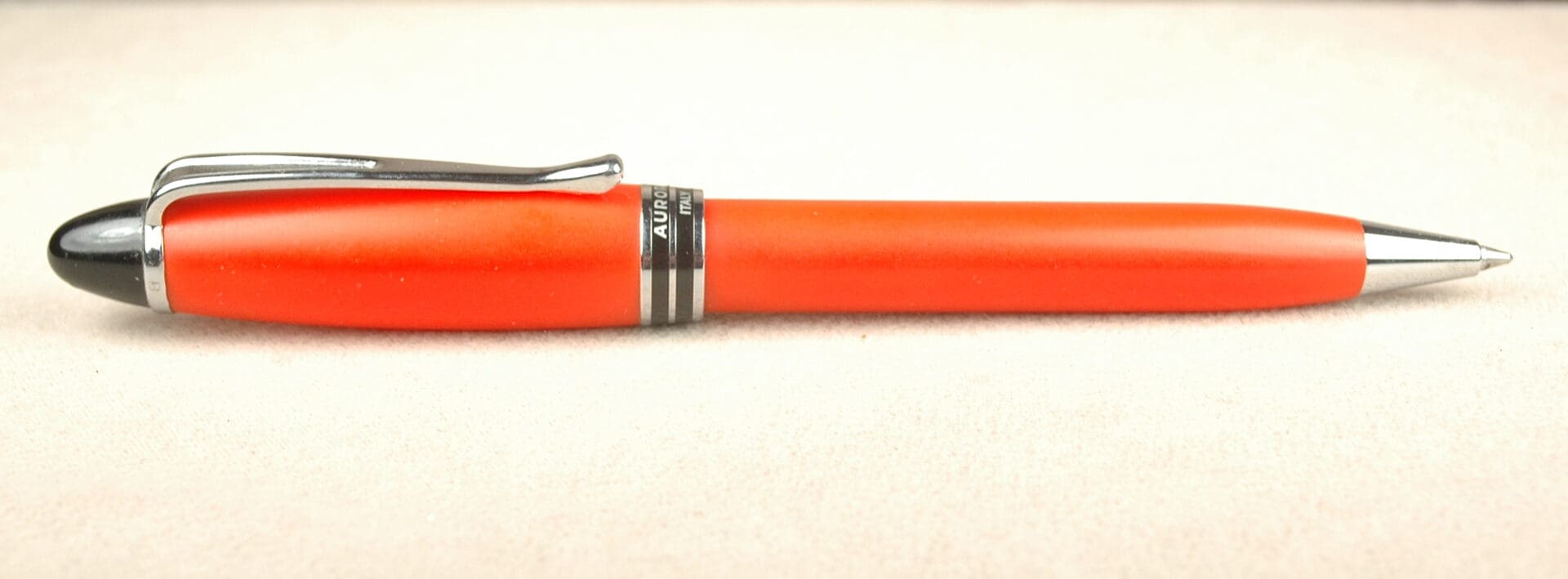 Add a flash of color to your pen rotation with the Aurora Ipsilon ballpoint. Great for writing at the office or at home, the tail cap clicks for an easy advance or retraction of the ballpoint. This preowned pen uses easy-to-find Parker-style refills. Our pen comes with a working black refill. It only show a little light wear. No cracks, dents or obvious scratches. Depending upon how your computer screen registers color, this pen is a beautiful orange that is just a touch below neon. This Aurora Ipsilon measures 13.7cm.