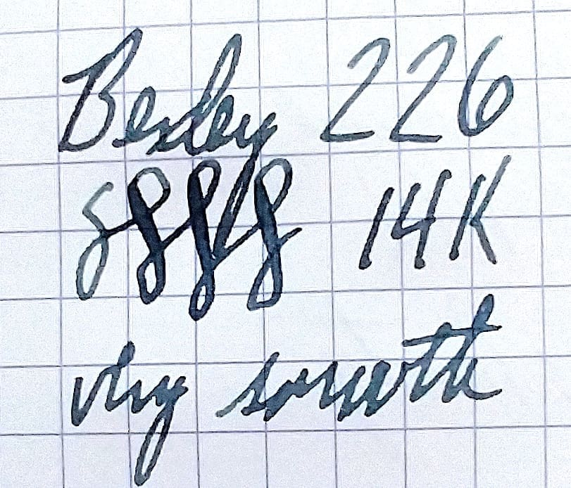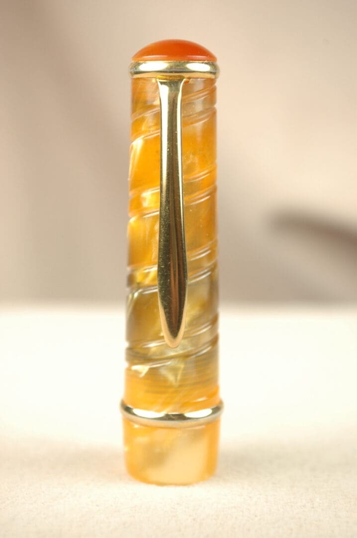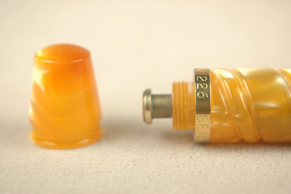 The Bexley Pen Company has an origin story very close to our hearts. The company started in 1993 when a small group of vintage pen collectors looked around at the options for modern pens and said, “We can do a lot better.” And in our humble opinion, they did. What sets this Bexley 226 and other early Bexley pens apart from the rabble of Montblanc, Waterman, Sheaffer and many others in the early 1990s was a devotion to vintage fountain pen filling systems and design sensibilities. Our fully restored Bexley 226 is a perfect example. It features a button-filler, just like a 1920s Parker Duofold. Yet, it features a much more modern, textured butterscotch acrylic cap and barrel that is warm and dazzling. They hadn’t perfected their manufacturing, yet, as the gold-plating has worn off the high spots on the trim. There’s discoloration in the cap from whatever material they used on the section, which also has some cosmetic issues. Nevertheless, they made sure to use a real 14k gold nib with just a little flex! C’mon, these were real vintage pen collectors who understood what made a fountain pen fantastic. You will write a smooth, wet medium line that can flex to close to 1mm. 14cm capped.