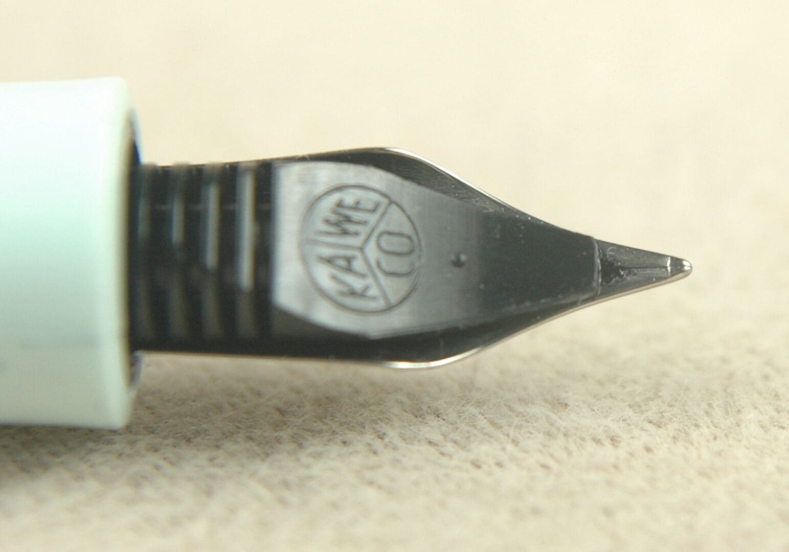 Probably the whole world’s favorite pocket pen, the Kaweco Sport is light-weight, durable and fits/goes anywhere. It is very affordable, too. This Kaweco Sport is a robin’s egg blue. Yet, it can pass as an arctic blue, now that it is winter. You fill this pen only by using short standard international cartridges. This pen sports only light wear from use. No cracks or deep scratches. Its steel nib is marked “EF” for extra fine. We find it writes a hyper-extra-fine line with feedback. Very razor thin! Made in Germany. The pen measures 10.5cm when it is closed and capped.