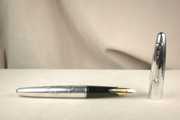 Namiki ranks as one of Japan’s top luxury pen brands. Our Namiki Silver Dragon is an impressive preowned luxury pen. Our Namiki Silver Dragon was a daily user that was well loved. You won’t find any dents or deep scratches. There is an odd little C-shaped scar near the tail and highlighted in the photos. You can see wear rings around the black-plastic section where the cap snugged against it. Fill this pen with an included proprietary converter. It also takes Pilot ink cartridges. (Pilot is a subdivision of Namiki.) You will write a reasonably smooth extra-fine line, even though the nib is marked “F” for fine. 13.8cm capped.