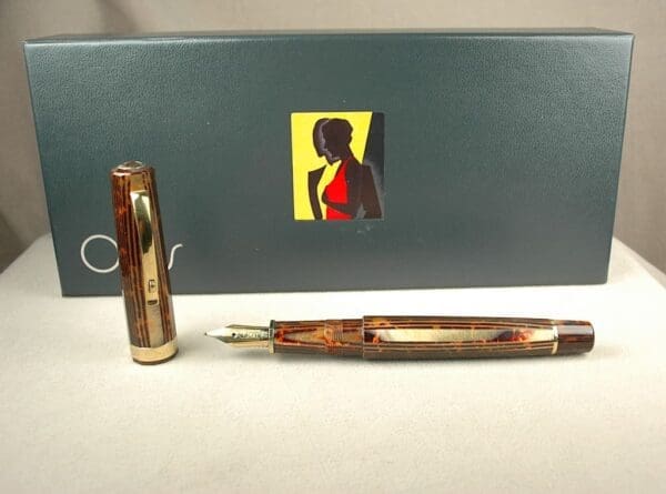 As if bronze arco celluloid wasn’t enough to get you excited, this is the grand poobah Omas Grand Paragon pen. Larger than a standard Paragon, our Omas Grand Paragon measures 14.75cm long. The height of Italian luxury pen making, this is a stunner for any collector. It is tough to see at a glance, but there is some wear on this pen that is quite visible up close. No cracks, deep scratches, brassing or other serious flaws. Just lots of wear from daily use. We found it by luck, as it came in an Omas Milord box with a leather sleeve. This was obviously not a Milord the second we set eyes on it. You will write a medium-broad line with its 18k gold nib. There’s a little light feedback, too. Its piston still operates smoothly.