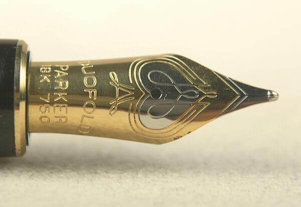 Reaching back into the past, the modern Parker Duofold Centennial features a stunning black-and-pearl design, much like its early celluloid models nearly 100 years ago. Unlike the vintage pens, the modern preowned pens have retained their incredible coloring. The Parker Duofold Centennial size is the larger version of this pen. Our pen shows light to minimal wear from use. It comes with its boxes and converter. We love the spade nib design in two-tone 18k gold. You will write a smooth medium line. “Q III” is the date code on the black tail piece. An elegant luxury pen that is a dependable everyday writer. 13.6cm capped.