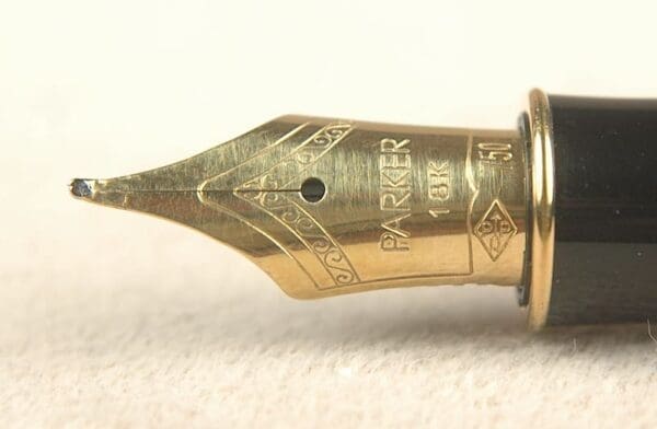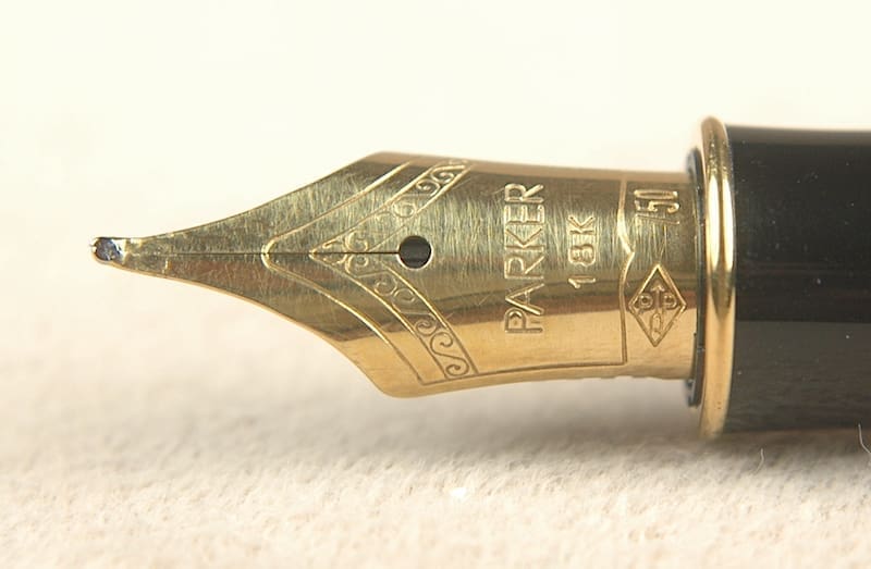 It is nice to find a Parker Sonnet with an 18k gold nib. We think most of them are plated steel these days. That would seem to date this pre-owned pen a little. Solidly built, this pen shows a some wear in places, but it is in great shape. It comes with a Parker converter, but it also can use Parker cartridges. Click the headline for close-ups. You will write a smooth broad line when you find the sweet spot. This pen also squeaks a little as it writes and can get a little scratchy outside of its sweet spot. 13.4cm capped.