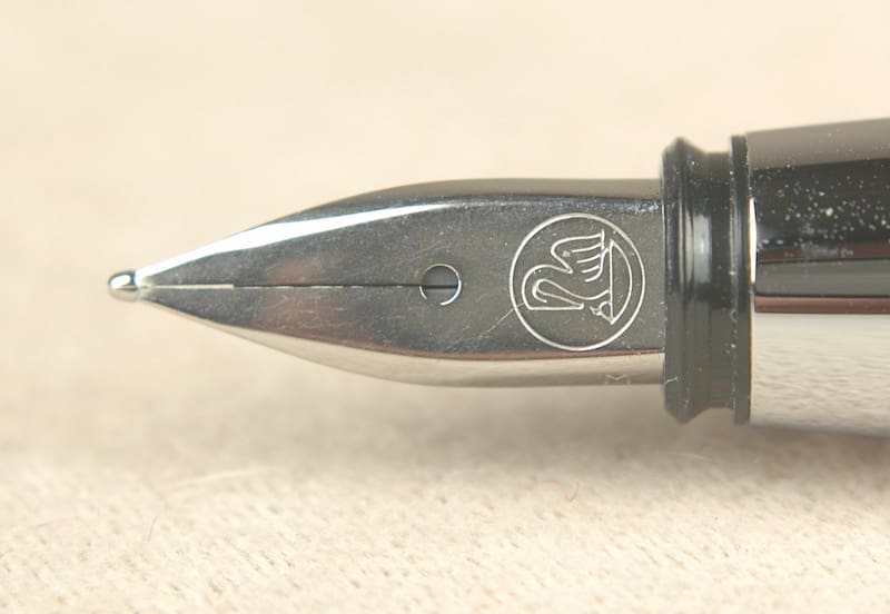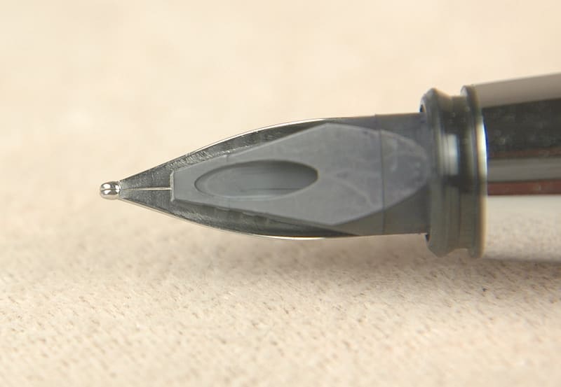 Prepare yourself for the ultimate industrial, luxury travel tank of a fountain pen. We don’t mean tank, as in it holds an unusual amount of ink. We mean tank, as in rolling steel artillery. LOL. The Pelikan P40 Pura is the ultimate travel pen that is nearly indestructible. Yet, it still has a very attractive blue-and-polished-steel finish. Best of all, its steel nib writes a smooth medium line that sings a little. Some people ask what we mean by “it sings a little.” It is a smooth writing nib that makes a little noise as you write…kinda like how they put sound effects on fountain pens in the movies. These pens were sold as cartridge-only pens, and it takes full-length standard international cartridges, which do hold a lot of ink. Our Pelikan P40 Pura has a little light wear from use but no cracks, no dents and no deep scratches. 13.7cm capped.