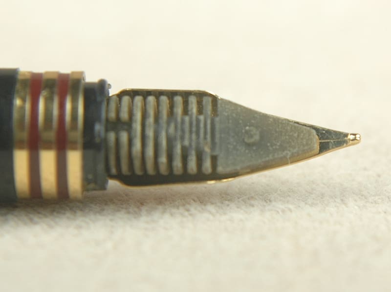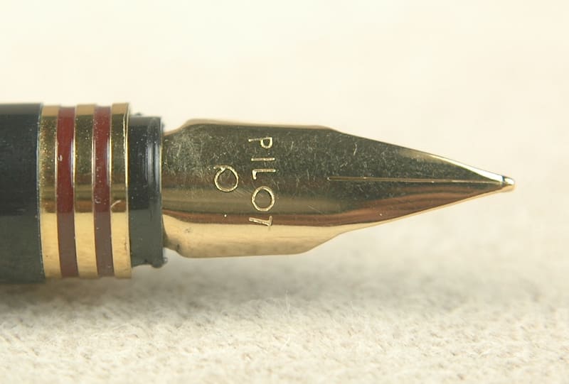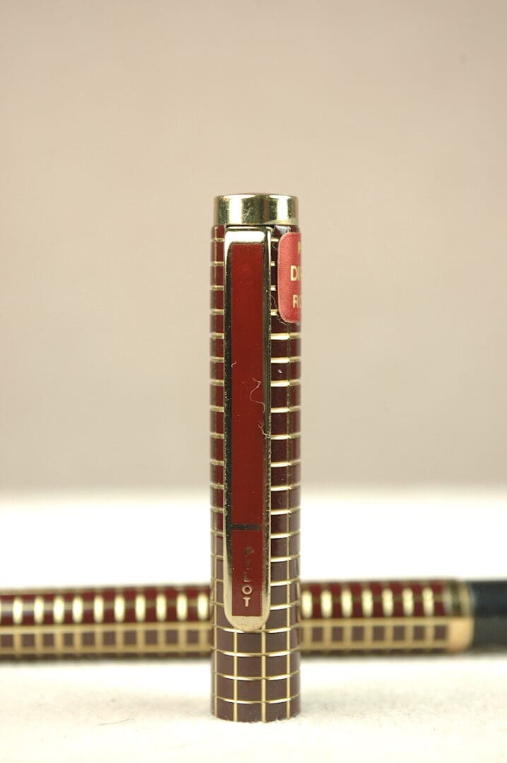 Bordering on vintage, the Pilot Dipper RC.F is a classic pen from the vaunted Japanese brand. Its slender design makes us think it is from the 1970s or ’80s. Burgundy squares boxed by golden grooves makes this a particularly handsome preowned pen. You can see it still has its original cap sticker. Aside from light scratching on the section, this pen looks brand new. Included is its working aerometric-style squeeze-bar converter. We filled the Pilot Dipper RC.F with water and it works well. There are no signs indicating this pen has ever been inked. As such, we didn’t dip it to test it out. It looks like a golden alloy nib with a fine-point tip. 13.2cm capped.