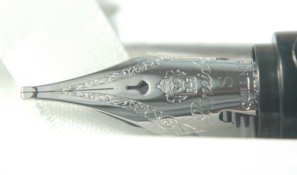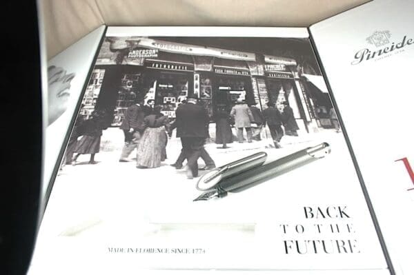 Great Scott! Pineider is another of the great Italian pen makers that we don’t feature often enough. Our preowned luxury pen is in mint condition. It is the limited edition Pineider Back to the Future. Numbered 76 of 949, this isn’t the Marty McFly “Back to the Future” you might be thinking of. This special edition focuses on Italy in the year 1949, as the nation emerged from the destruction of World War II–a time of rebuilding, it was leading the way in fashion, art and culture. The futuristic design of the pen is based on the concept of an Egyptian reed stylus made of modern carbographite. You fill the Pineider Back to the Future with a piston. It writes with a stunning 1.3mm stub nib made of 14k gold. Also included are its original box and a handsome coffee table back by designer and film director Pier Luigi Pizzi as he looks back on that golden age. The photos are lush and classic. However, the text of the book is in Italian. 14.7cm capped.