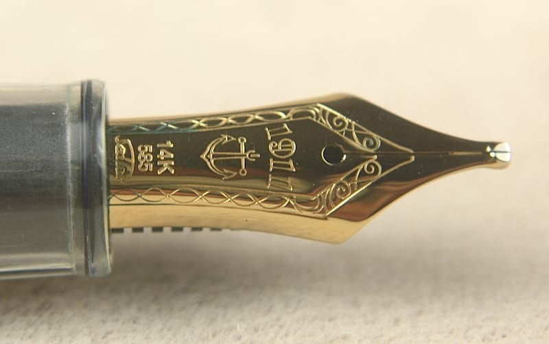 All mysteries are revealed with a good demonstrator pen. This Sailor 1911 Demonstrator leaves little to the imagination. It is really fun to write with and fill. The fact that it has an M-S (“music”) nib made of 14k gold could make this your very favorite preowned pen. In truth, we find this nib to be buttery smooth, but it writes more like a double broad. Its thick tipping does not give it a ton of line variation. Our preowned luxury pen has minimal wear and there are only a couple traces of blue ink trapped in the inner cap. The Sailor 1911 Demonstrator measures 13.5cm capped.
