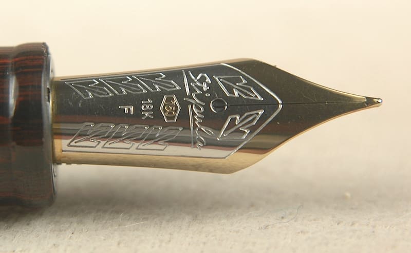 Italian artisans resurrected the lost art of orange-hard-rubber pens with woodgrain designs when developing the Stipula Novecento fountain pen. Sterling silver accents turn this pen from simply functional to a functional work of art. The piston filler is a little stiff but still works well. We restored the finish by removing all the chocolate hazing. The finish is about 98% haze free and looking really sharp. You will write a fine line with its two-tone 18k gold nib. It has a little feedback. A delightful preowned luxury pen that can be a real highlight for any collection. Our Stipula Novecento measures 13.9cm capped.