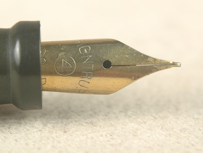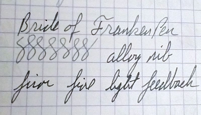 It’s alive. It’s aliiiive! The Bride of FrankenPen looks like a 1940s Waterman on a quick glance, but it has the wrong section, nib and inkfeed. In spite of its many flaws, we firmly believe that even ugly pens need love. So we gave it a new ink sac and got it working, again. Yeah, there’s deteriorating celluloid on the ends. There’s brassing and corrosion on the metal trim. It has some goofy golden alloy nib by “Signtru.” Whatev’s? We really don’t care and we aren’t charging much. It just needs a home that will love it. Maybe a vintage work horse that’s good for travel because you won’t miss it, if it walks off. Maybe a beginner pen for a young writing enthusiast. The Bride of FrankenPen ‘s nib is fine, firm and only has light feedback. 12.9cm capped.