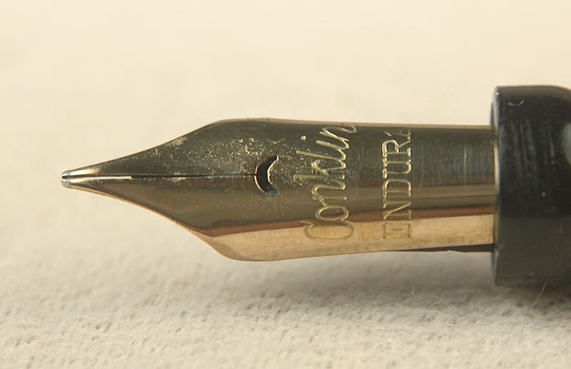 Conklin broke their own mold by releasing the stunning Endura line of pens and pencils in the mid-1920s. Our Conklin Endura is an early variant, as it is made of orange hard rubber with a woodgrain design. There is some wear from use and brassing on the cap band and trim. We restored this pen with a new ink sac. No cracks. You will write a juicy broad line with its 14k gold nib. A fun user for any vintage pen fan. 12.2cm capped.