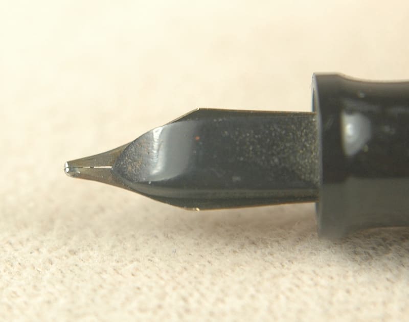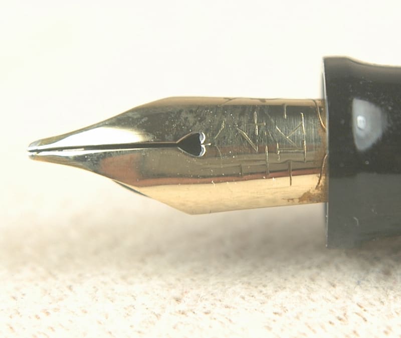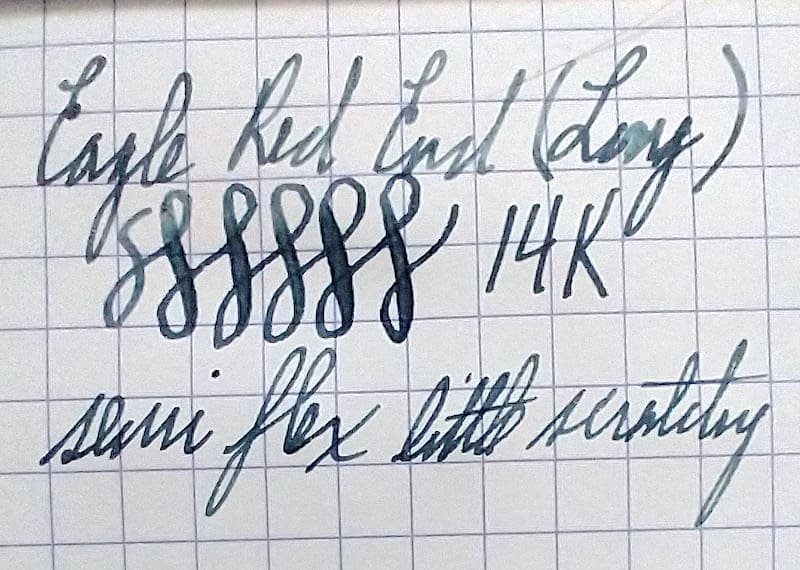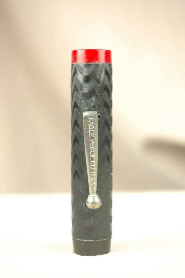 There’s an old Shel Silverstein poem with the line, “Almost Perfect but not quite.” That best describes our Eagle Red End (Long) fountain pen. The chasing on the gleaming black hard rubber and the imprints are so incredibly crisp. No cracks nor any significant imperfections. The metal trim looks a little tired but not terrible. We restored this vintage pen with a fresh ink sac. So what’s the problem? This Eagle Red End (Long) is missing its tail’s red end! I don’t know if we or anyone will find a replacement end for this pen, but the rest of it is so close to perfect that it seems to us someone would still love it in their collection. You will write with some nice line variation with its 14k gold nib. Other pen shops don’t describe nibs this way, which might make it a little confusing, but to us the nib feels a little thin and reedy, which makes it a bit scratchy. Yet, we suspect most people will be interested in this pen for its collectible status. 12.9cm capped.