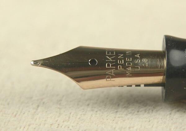 We don’t think we can call this a pure-bred Parker Challenger. It seems to us that some long-ago repair person fitted it with a new cap band and section. We don’t think that Parker Challengers ever came with an ink-view window. And although this section fits well in the barrel, the grip seems a size to small for the barrel. Regardless, we restored it with a new ink sac. ANNNND, it is a great writing pen with a delightfully smooth medium-point 14k gold nib! Our vintage pen shows the wear of past hard work, but there are no cracks. Ready for more hard work, this pen can make for a great daily driver. 13cm capped.