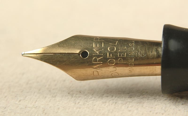 Mandarin yellow Parker Duofold Juniors are not the most common of colors. Yet, streamlined versions are even more difficult to find. Our vintage pen was fully restored with a new sac several years ago. The photo doesn’t showcase the nuance of the colors in the cap and barrel. The of the cap is a couple of shades lighter than the barrel. However, the barrel is inconsistent with some spots darker or lighter than others. The imprint is fairly well worn. No cracks. Minimal, if any, brassing. You will write a buttery smooth, wet fine line with its 14k gold nib. 11.5cm capped.