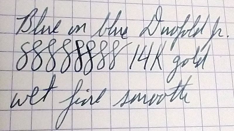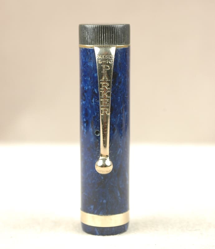 Collectors desire blue-on-blue lapis lazuli Parker Duofold Jr. pens more than most of any of the color options. It was only made for a year, and the white-flecked lapis color is more common. Our vintage pen has no cracks or significant scratches. There is a bit of brassing on the ball of the clip and some chocolate hazing on the black hard rubber pieces. The only discoloration is near the barrel threads. We restored this Parker Duofold Jr. with a new ink sac and pressure bar. Nice, crisp imprints. This pen also sports the original “Christmas tree” ink feed. Write a great wet, fine line with its 14k nib. 11.6cm capped.