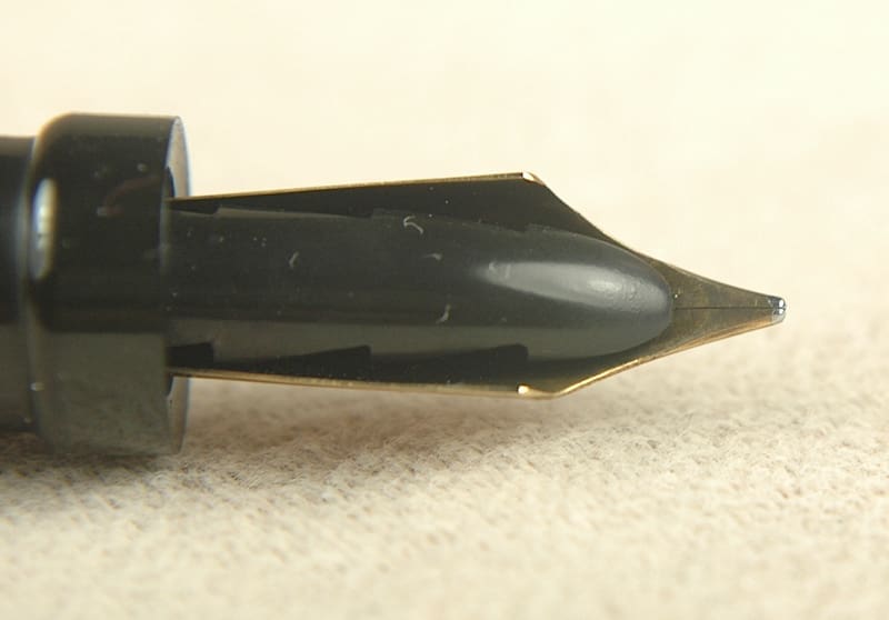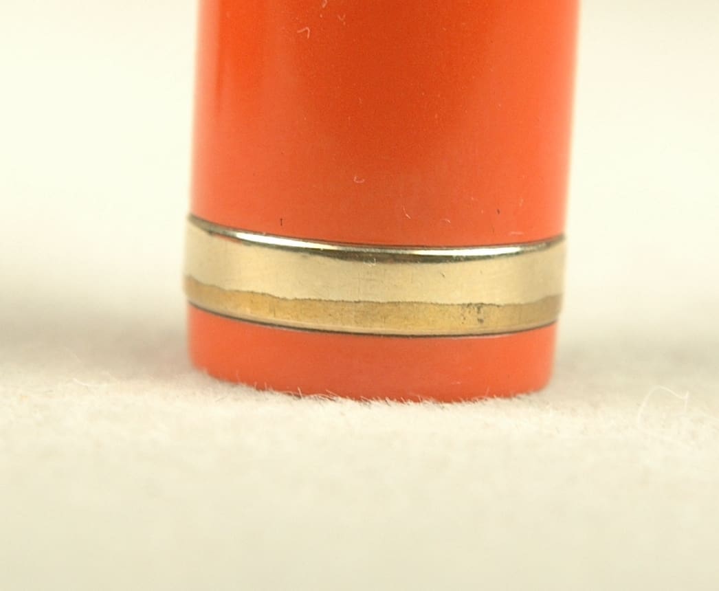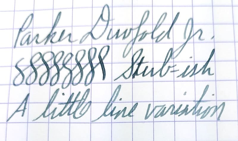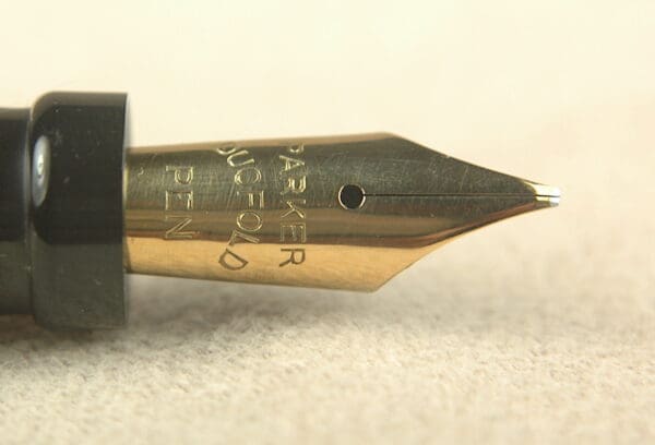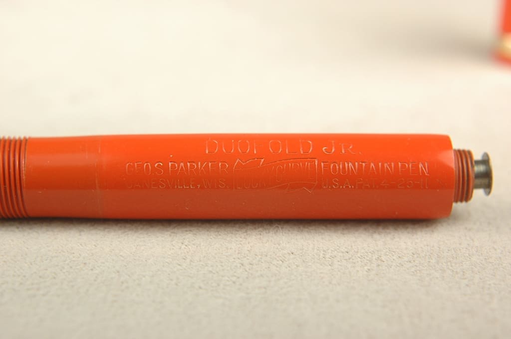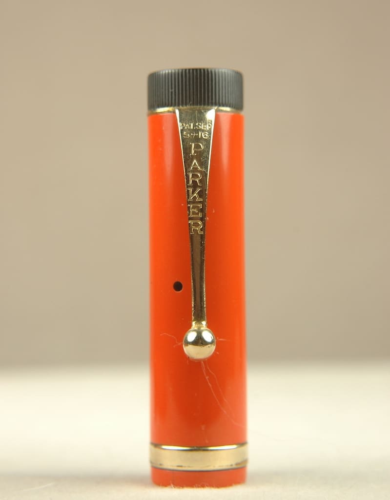 The original orange hard rubber Parker Duofold Jr. really electrifies any collection with its vibrance. We love this color compared to the slightly later permanite versions of the vintage pen. At first glance, this pen is absolutely stunning. The color is great. Not only is the orange blazing, but the black end caps are deep, jet black with really crisp milling. It has the original “Christmas tree” inkfeed. We restored this pen with a new ink sac. The imprint is still pretty sharp. However, there is a little crack in the lip of the cap, and the cap band and clip show some brassing. The orange color isn’t 100% consistent. Its 14k gold nib is what we are calling stub-adjacent. You will see this Parker Duofold Jr. has a little line variation but nothing dramatic. 11.6cm capped.