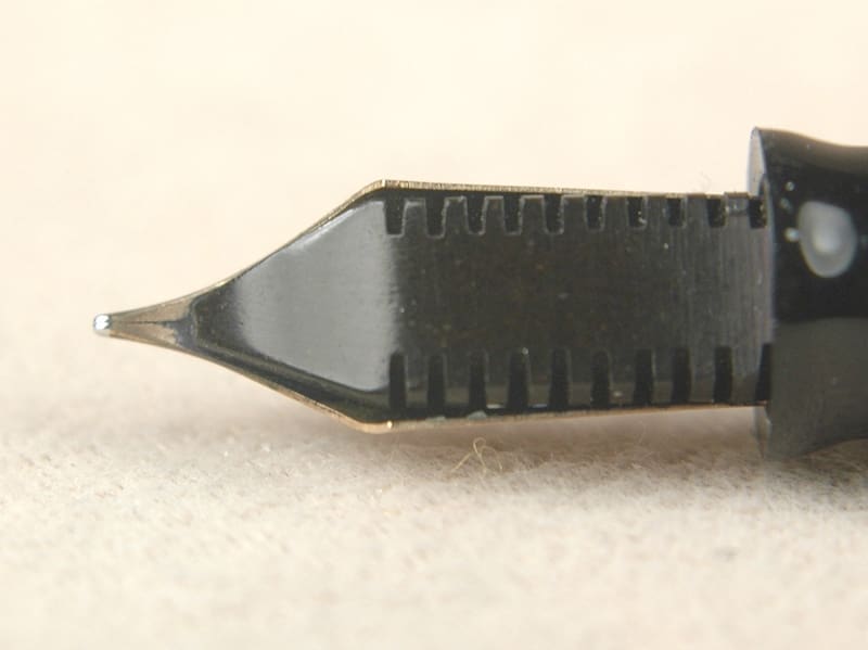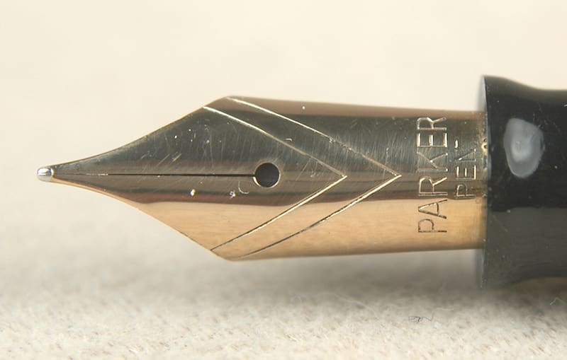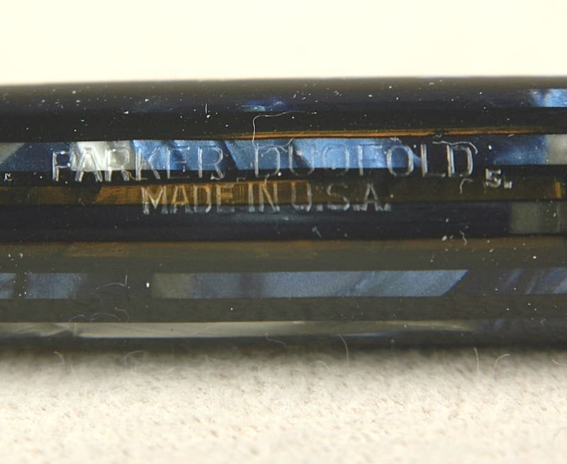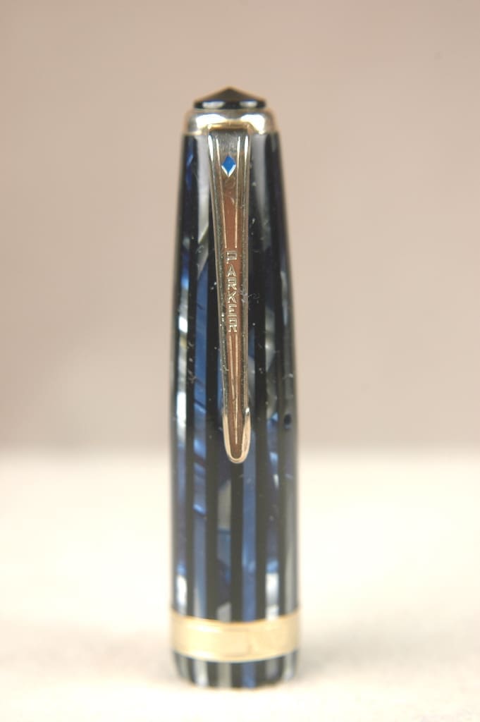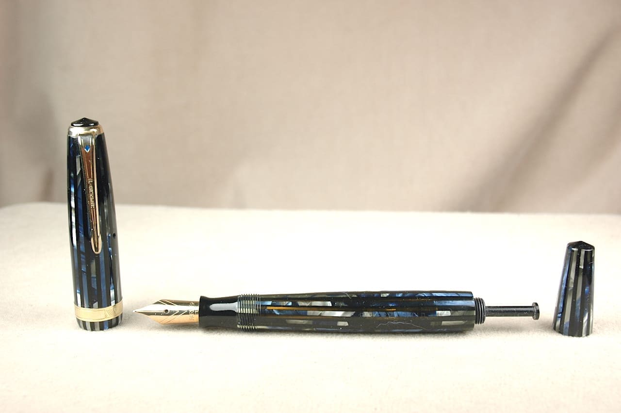 We like to consider the Parker Duofold (Vac) as the second generation of the famed Parker Duofold. These received a complete art-deco overhaul after the “Big Red” era. Our blue-and-grey model is fully restored with a new diaphragm in its Vacumatic filling system. You will see a third-quarter 1945 date code in its crisp imprint. The whole vintage pen is very crisp for 80 years old. No cracks or significant wear. Best of all, it comes with a 14k gold “Victory” nib. You will write a nice fine line with a touch of feedback. Another great element of the pen is its very clear barrel. It is tinged yellow-green. Our Parker Duofold (Vac) is the large model measuring 13.6cm capped.