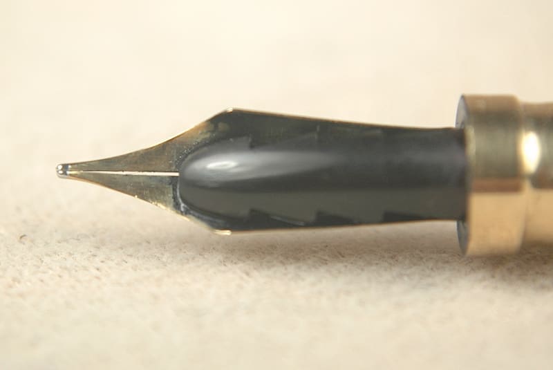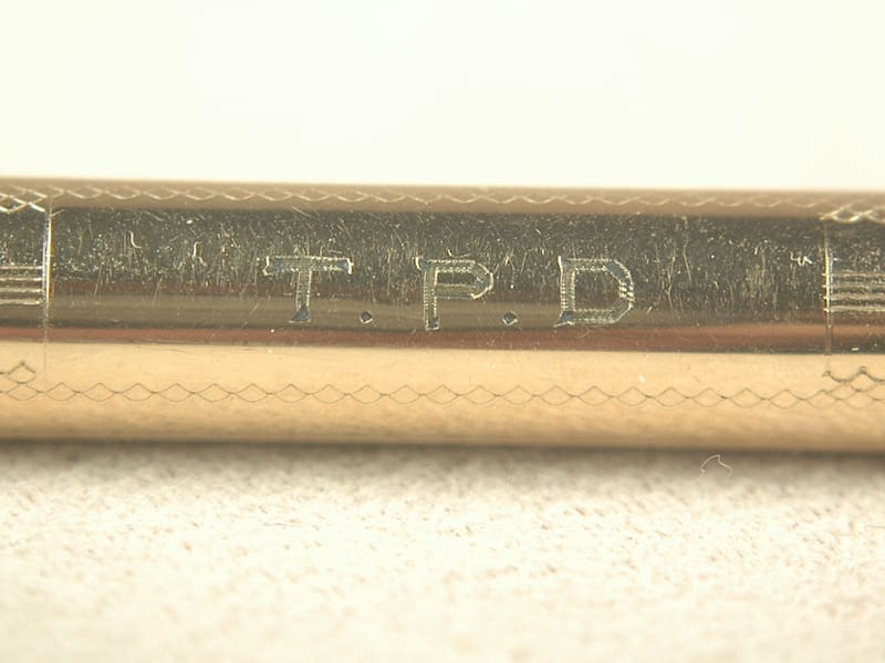 Step back into a more elegant era with the Parker Lucky Curve ring-top pen. Our vintage pen comes with a working button-filling system that appears to have been restored before we got it. Our gold-filled pen is remarkably dent-free. No major scratches, either. The initials T.P.D. are engraved on the cartouche. The only major problem with our Parker Lucky Curve is that its nib seems a little too long for it. It is an original #3 Lucky Curve nib. There is a “Christmas tree” inkfeed under the nib. The nib just is too long to align perfectly with the feed, and you cannot tighten the cap down because you will ruin the nib.  You will love the smooth writing experience of the nib, though. It writes a very nice extra-fine line and has a little flex if you are slow and gentle. 11.2cm capped.