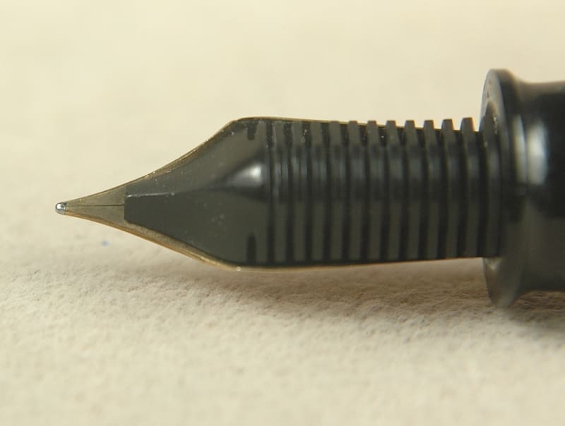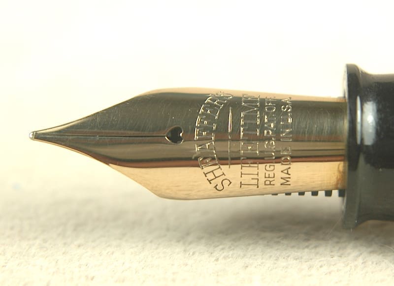 Dazzling writers since the 1930s, these oversized Sheaffer Balance Lifetime pens are simply masterpieces for all ages. You can see why from its grey striated design with nickel trim to its simple lever-filler to its easy gripping wide barrel. Best of all is its 14k gold Lifetime nib. We restored this vintage pen with a new ink sac. You will see only the slightest of wear on this gleaming Sheaffer Balance Lifetime. There is only a whisper of brassing at the top and bottom of the cap band. Kissed by only the lightest of wear, you won’t find any cracks or ugly scars. It has a nice, deep, crisp imprint on the barrel. You will write a smooth, dry extra-fine line. The nib might need a little breaking in to help keep up the flow of ink. 14cm capped.