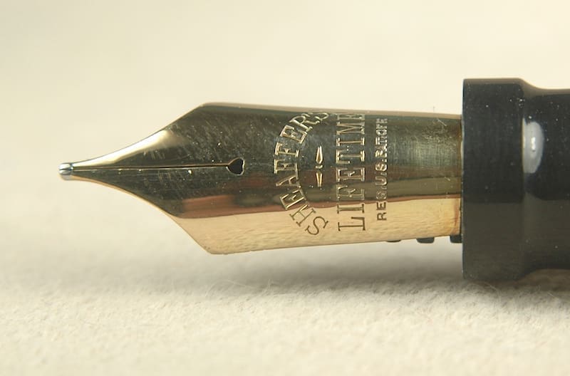 Here’s a chance to get a relative bargain on a fairly rare vintage pen. Look closely. Notice anything unique about this oversized Sheaffer Lifetime flattop in black hard rubber? No white dot. No serial number on the 14k gold Lifetime nib. This pen was made before Sheaffer developed its famed white dot logo for Lifetime pens! And it was before Sheaffer lost an early lawsuit to black-market dealers of its pens because the Lifetime nibs had no serial number to track the pens. There is a fair amount of brassing on the trim. Also visible is a little triangle chip in the lip of the cap that some long-ago repair person super glued. A hairline crack sprouts out of the right side of the pocket clip mount. There are scratches and faded imprints. We restored this Sheaffer Lifetime Flattop with a new ink sac. You will write a deliciously buttery smooth broad line with its early original 14k gold nib. 13.6cm capped.