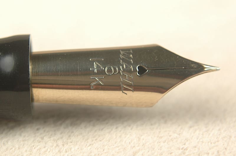 Perfection in vintage pens is such an elusive target. This Wahl-Eversharp Gold Seal gets awfully close. Its “Brazilian Green” or “Bronze Green” finish is stunning without much, if any, discoloration. There is no brassing on the oversized fountain pen except for a tiny sliver on the edge of the lever. Fully restored, both the vintage pen and pencil work well. Under a bright light you can see some shallow scratches on the caps and barrels. You also can see some marks where the pen’s cap rubs against the barrel when it closes. Very minor wear for a vintage pen, but it didn’t just roll off the assembly line.