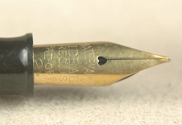 Turquoise is an unusual name for this blue-and-gold Waterman Lady Patricia. Though it might not be what is conventionally known as turquoise, it is a beautiful vintage pen. We restored it with a new ink sac. There are no cracks or deep scratches. However, it does show wear from use. The plating is missing from its lever box, and there are dents in the cap band. The lip of the cap appears to be black. You will be blown away by its 14k gold #2 nib. Sure, the top looks scruffy, but it writes a wonderful semi-flex line that is wet and goes from fine to about 1mm wide. It is fairly smooth, too. Our Waterman Lady Patricia is a great writer. 10.8cm capped.